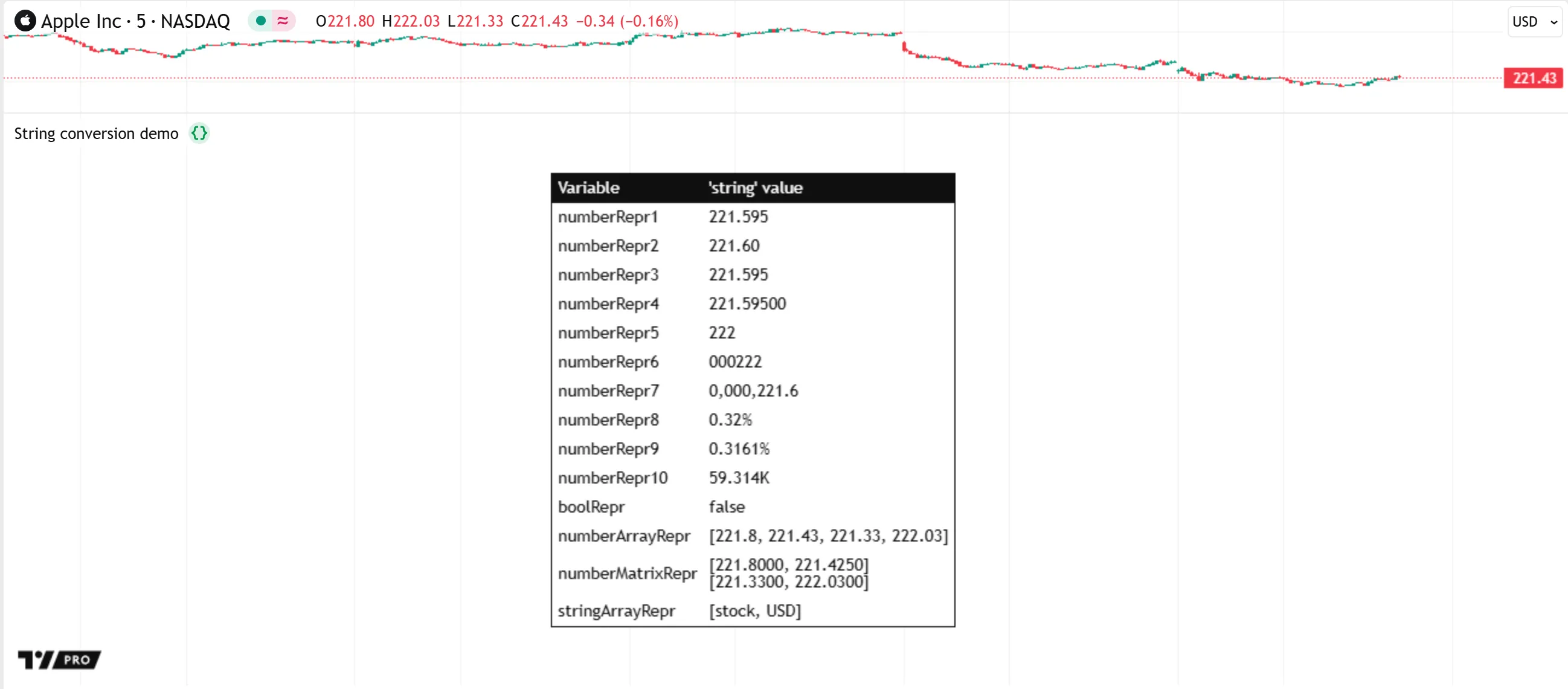 The script below uses the str.tostring() function to convert numeric values, a “bool” value, arrays, and a matrix into strings and displays the results in a table on the last bar. The str.tostring() calls that convert numeric values and collections contain different format arguments to demonstrate how various formatting patterns affect the results: