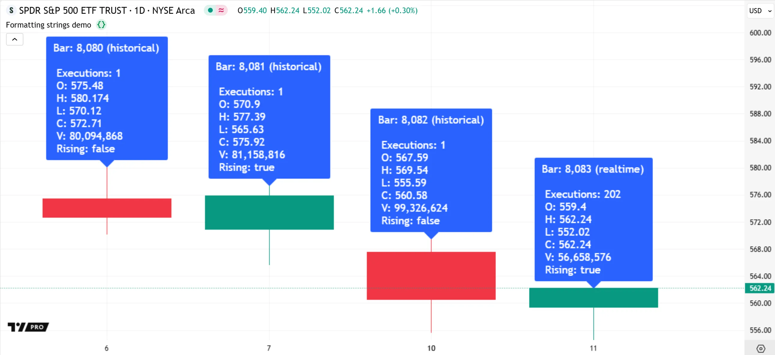 The following example constructs a formatted string containing various bar information, then displays the result in a label at the bar’s high. The str.format() call’s formatString argument includes placeholders for 10 values, where each placeholder’s number corresponds to one of the additional “string”, “bool”, “int”, or “float” arguments: