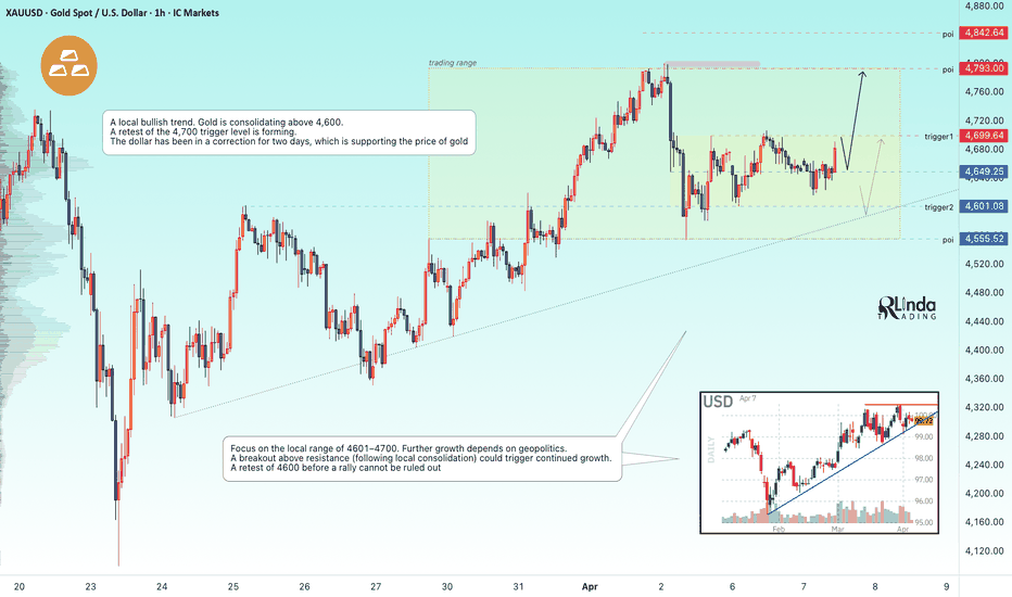 GOLD - Consolidation amid a bullish trend. Trigger at 4700 ICMARKETS:XAUUSD is consolidating above 4,600 as part of a local uptrend. The dollar is in a correction, and the market is picking up on subtle hints of potential negotiations regarding the Middle East...