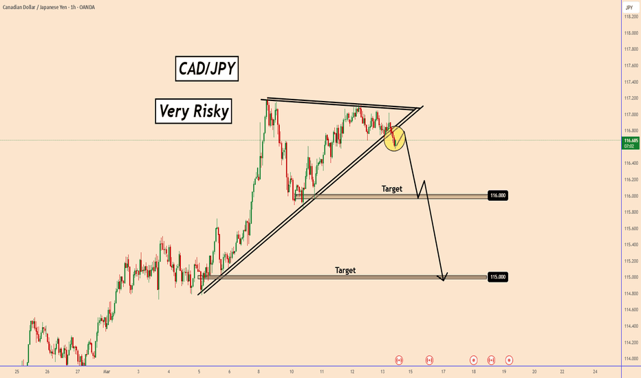 CADJPY is currently trading inside a rising wedge / triangle structure, where price is compressing between the rising support and descending resistance.