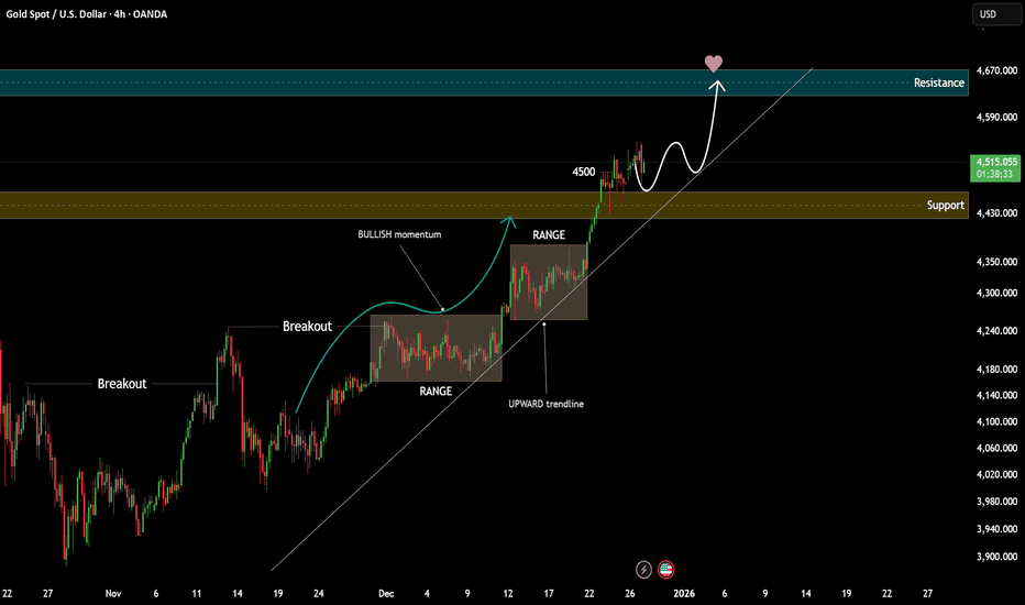 Lingrid | GOLD Weekly Outlook: Consolidating for the ClimbOANDA:XAUUSD perfectly played out my previous weekly idea . Gold push toward $4,500 has stalled as bullish momentum wanes ahead of year-end, with price now testing the upper boundary of its recent range near $4,530. 4H chart clearly shows the market is losing steam, hinting at a short-term pullbac