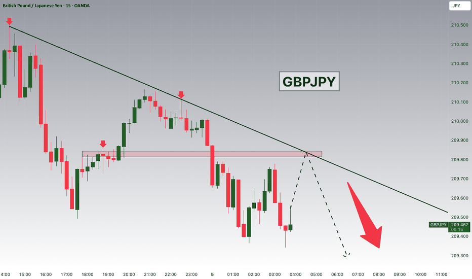GBPJPY remains in a clear downtrend and is currently undergoing a corrective pullback, approaching a key trendline confluence and the 209.900 support–resistance zone. This