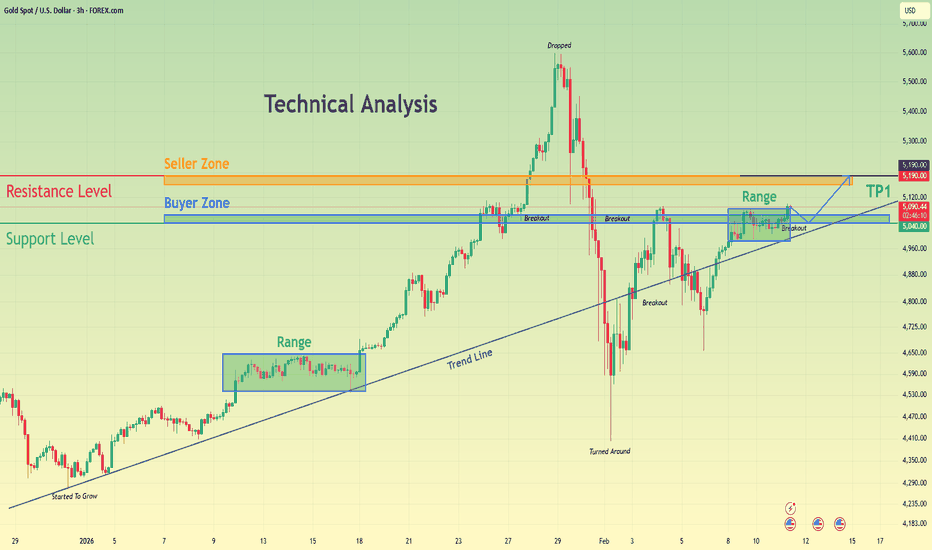 XAUUSD Builds Strength Above Demand - Next Target $5,190Hello traders! Here’s my technical outlook on XAUUSD (3H) based on the current chart structure. Gold is trading within a broader bullish market structure, supported by a well-defined rising trend line that has guided price higher over time. Earlier in the move, price entered a consolidation phase, f