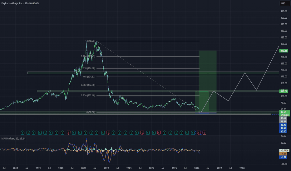 Paypal Bottom is in ?! Long from herePayPal Holdings (PYPL) is currently trading at approximately $40.42 (as of the latest close, +1.30% on the session), marking a continuation of the multi-year downtrend from its 2021 peak of ~$310–$340.