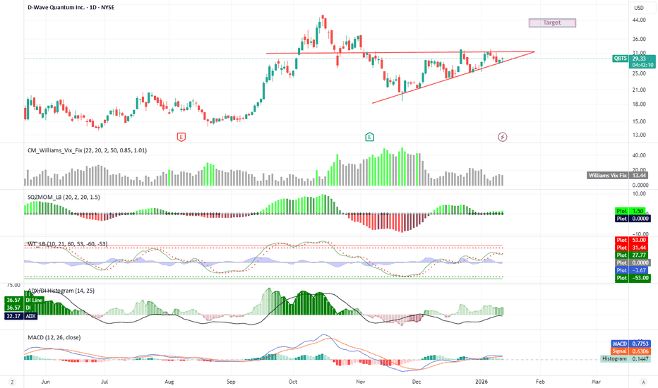 QBTS: Ascending Triangle Coiling for Breakout – Target $42D-Wave Quantum (QBTS) is forming a classic Ascending Triangle pattern on the daily chart, consolidating recent gains while consistently setting higher lows. The price is compressing against the overhead resistance at $31.50, signaling a buildup of pressure ("The Squeeze") for a potential breakout.