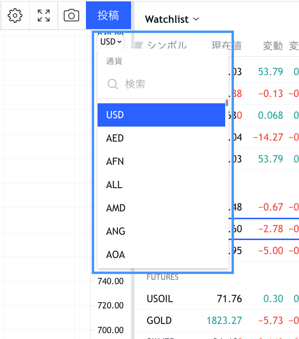 チャート上の通貨を変更するには、価格スケールに表示されている通貨ボタンをクリックして、