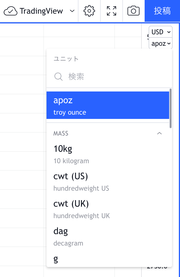 変換が可能なチャートで単位を変更するには、価格スケール上の現在の単位を表示するボタンをクリックして、ドロップダウンリストの中からご希望の単位を選択してください。