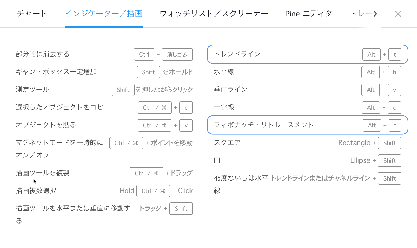 「トレンドライン」の描画は、キーボードショートカットの Alt (Windows) / ⌥ (Mac) + T を押してクリックして開始するだけです。「フィボナッチ・リトレースメント」の場合は、Alt / ⌥ + F です。とても簡単です。