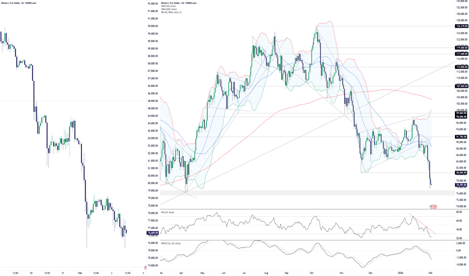 Looking at the daily timeframe on the right, RSI (14) continues to trend deeper into oversold territory, sitting at 22.03, similar to levels seen in November 2025 just ahead of a bounce. As was the case then, price is also trading below the lower Bollinger Band, again reinforcing how stretched bitcoin looks after falling more than 20% since mid January.