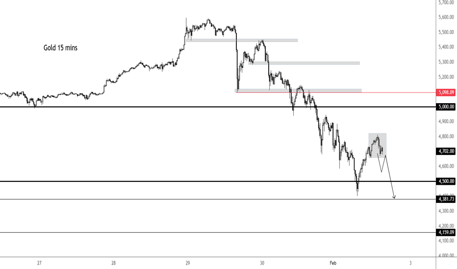 Gold's intraday bounce already over?Short-term price action on gold looking a bit bearish. The bias on the daily turned bearish after Friday's big slide, so a lot of people would be looking to sell into rallies now, I'd imagine. On this 15m char you can see that the kick back rally has lost some momentum. A breaking below 4680ish could trigger the next liquidation phase, taking prices back to 4500 potentially, or even lower.