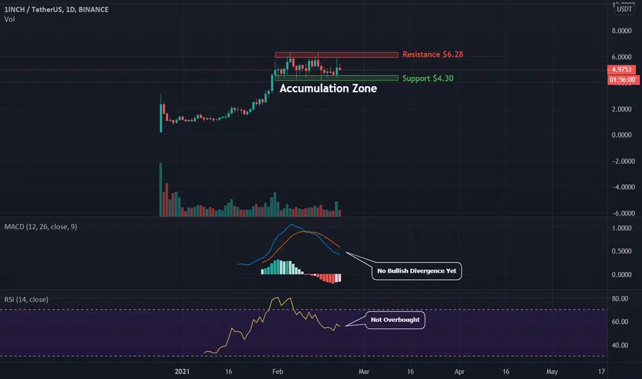 As of right now 1INCH has been in accumulation for a solid month forming a nice sturdy support floor of $4.30 and we have an all time high resistance of around $6.28 I suspect 1INCH to continue to run and set new all time highs once this accumulation period ends its course.