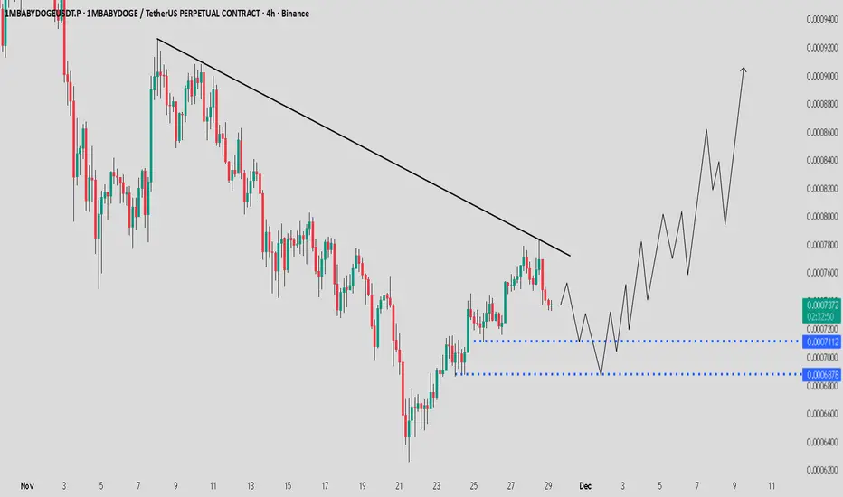 1Mbabydoge / USDT has declined from the trendline resistance and is now moving to grab liquidity below the marked zones. Once price reacts from these levels, a potential 20–25% move can follow.