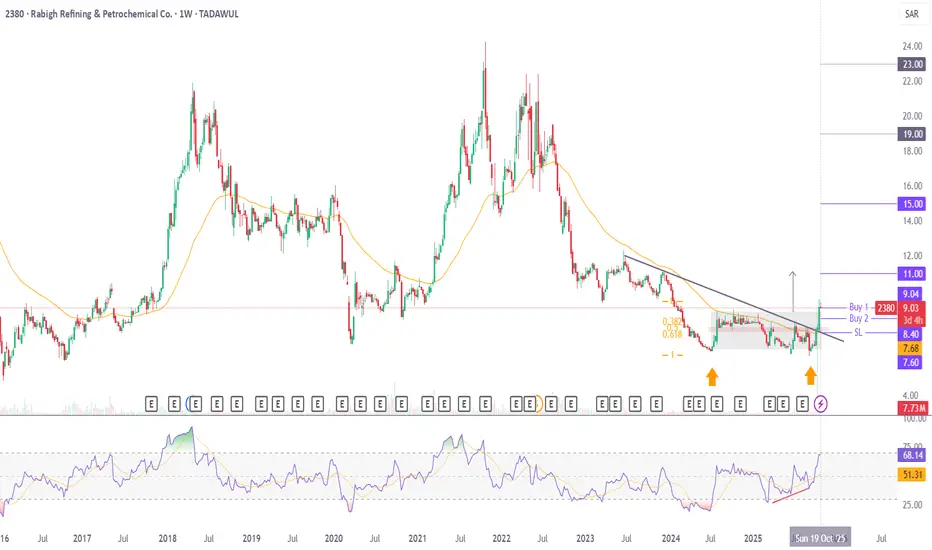 Price has broken out of a bullish rectangle pattern on the weekly timeframe, supported by bullish divergence and strong volume. On the monthly chart, it has formed a double bottom and hidden bullish divergence, while continuing to move within a long-term range between 26 and 6 since 2009.