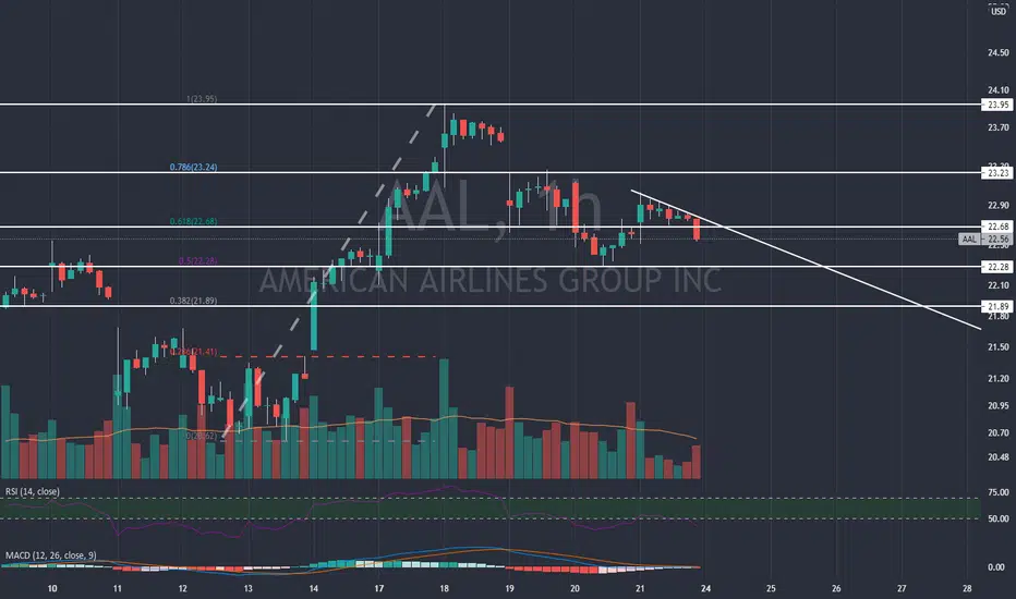 Fibonacci levels definitely had a big influence on AAL price action the past week. On Friday price broke down through .618 with volume. Last time this happened on 5/20 it went down to .5 level ($22.28). Looking to short on Monday if things are bearish.