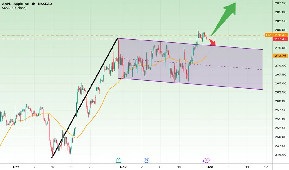 After a strong rally (black trendline), AAPL entered a descending corrective channel, which looks like a classic bull flag pattern.