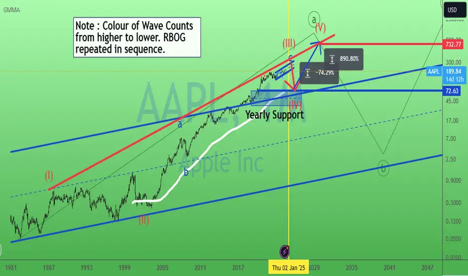 AAPL bigger picture on monthly chart, possible a more than 70% (-74.29&) drop on year 2025 toward 72.63 +/- which is multi confluence zone of 1) Monthly 233 EMA ( thick white MA line) 2)Upper Support of parallel channel ( blue line) 3) Yearly Support Zone.