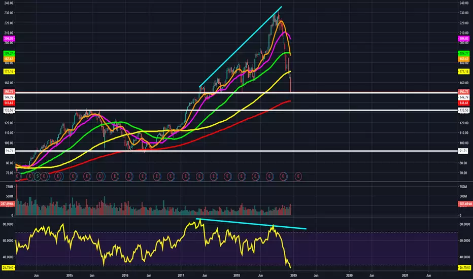 APPL has been on an all out waterfall these last 2-3 months. Price action is currently holding a prior support zone that we saw it hold back in February of 2018, but I think we will see APPL retest the 200 weekly moving average, and if we break below it, we could be setup for more downside. In line with several other stocks I've done Tradingview posts on, APPL also had clear bearish divergence form. We saw price action make a higher-high, while the RSI made a lower-low (as shown by the light-blue lines on both the price action and on the RSI.) There is a possible support zone around 130-132 should the 200 weekly MA get purged, but I'm really watching that 90-95 dollar area, as for we saw it hold on 4 separate occasions back in 2015-2016, but I wouldn't put too much emphasis on it just yet, and would focus more on the price action and the overall market sentiment.