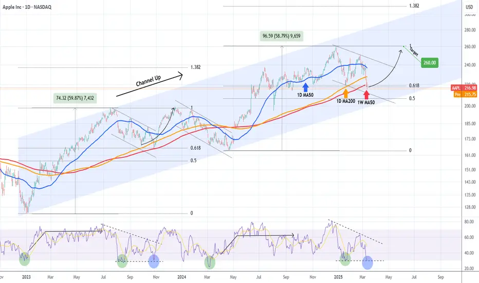 Apple Inc. (AAPL) has been trading within a 2-year Channel Up since the January 03 2023 bottom and in the past 3 months (December 26 2024) has been forming the latest Bearish Leg. On Tuesday this Leg broke below its 1W MA50 (red trend-line) for the first time in 10 months (since May 08 2024), which is the strongest buy signal since the April 19 2024 Higher Low bottom of the Channel Up.