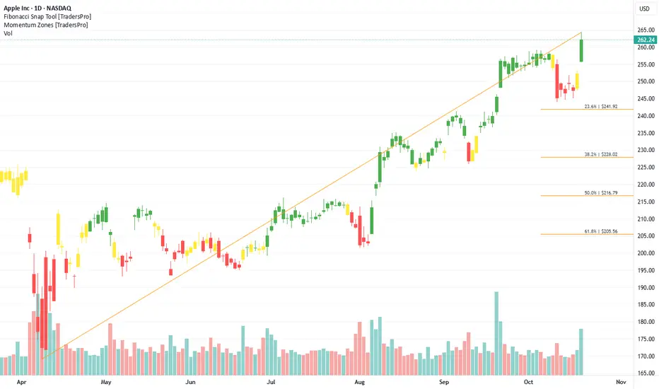 On the chart, a confirmation bar with rising volume highlights bullish momentum. The price has entered the momentum zone after climbing above the .236 Fibonacci level. A trailing stop can be placed just below this Fibonacci line using the Fibonacci snap tool, helping traders protect profits while leaving room for continued upside potential.