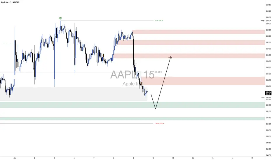 The broader market structure shows that AAPL recently transitioned from a bullish leg to a clear short-term bearish phase after a strong Break of Structure (BOS) at 259.24, which confirmed a shift in control from buyers to sellers. Price failed to make a new high after the last rally, and the subsequent drop formed a decisive lower low, reinforcing bearish intent. The Change of Character (CHoCH) sits lower at 251.04, and if price were to breach that level, it would signal deeper downside continuation and confirm that higher-timeframe buyers have lost momentum.