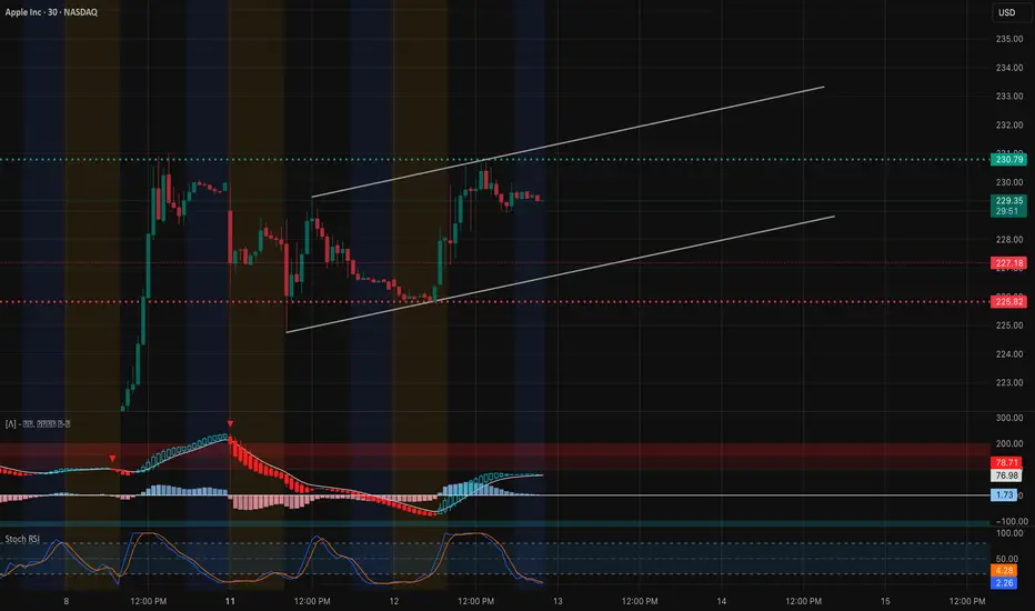 AAPL is trading inside a rising channel, showing steady higher lows but stalling under $230.79.