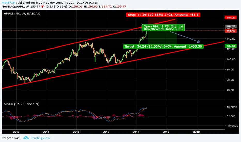 apple is coming up to the weekly trendline where i will be looking for a reversal or news that may start the reversal. will keep this chart updated closer to the time
