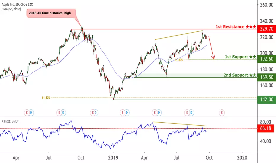 AAPL expected to rise up to 1st resistance at 229.70 where it could potentially react off and drop down to 1st support at 192.60.