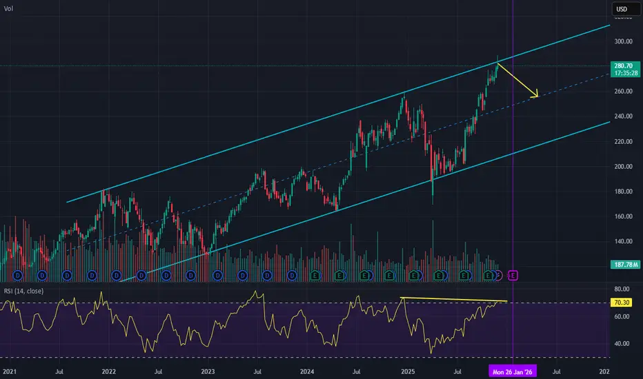 Potential downside? APPL is at the top of the range of an ascending channel, with bearish divergence forming in the RSI. Expected pull-back price to be $250s zone.