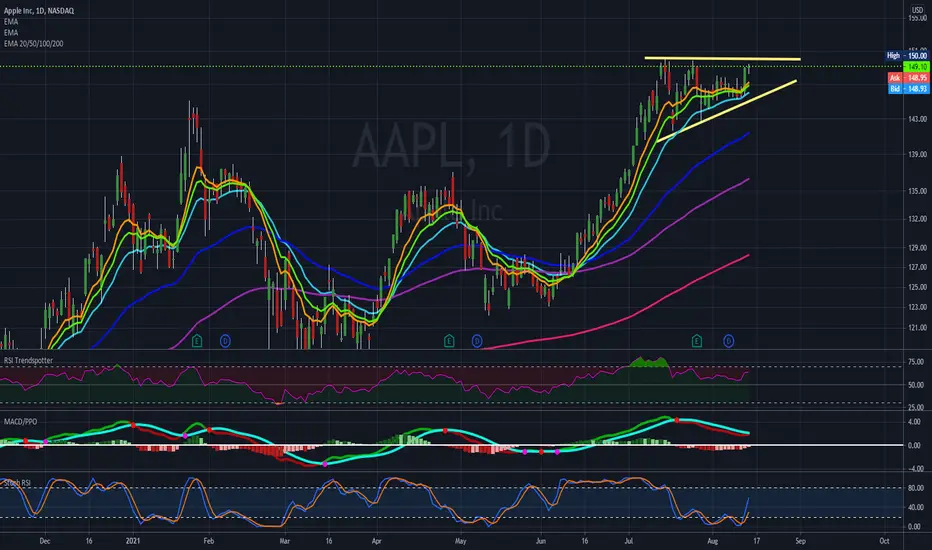 Apple (NASDAQ:AAPL) seems to be forming an ascending triangle pattern, a bullish continuation setup that typically breaks upward. Breakout watch over 149.78