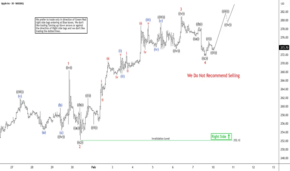 The cycle from the January 21, 2026 low in Apple (AAPL) is unfolding as a five‑wave Elliott Wave impulse. From that low, wave 1 advanced to $268.34, followed by a corrective pullback in wave 2 that terminated at $252.12. The stock then resumed its upward trajectory in wave 3. Within this third wave, wave ((i)) concluded at $261.90, while the subsequent pullback in wave ((ii)) ended at $255. Momentum strengthened thereafter, carrying the stock higher in wave ((iii)) toward $279.50. A modest dip in wave ((iv)) found support at $273.50, before the final leg, wave ((v)), reached $280.90. This marked the completion of wave 3 at a higher degree.