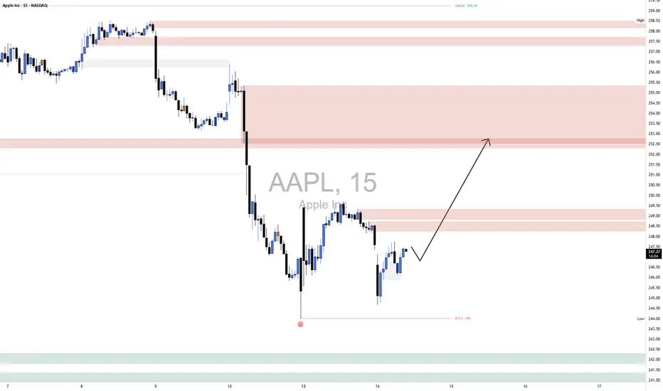 Apple remains in a short-term downtrend, following a clear Break of Structure (BOS) to the downside around $244, confirming bearish continuation from the prior lower high near $254. However, the recent candle formation suggests a possible Change of Character (CHoCH) as price begins to stall and form higher lows around the $246–$247 area, indicating early signs of accumulation.