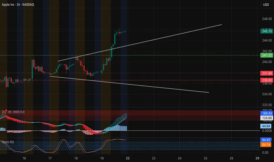 * Price action: Apple closed near 245.70, powering through resistance with a strong run on Friday. Price is hugging the upper side of a rising channel after an explosive move from the 237 area.