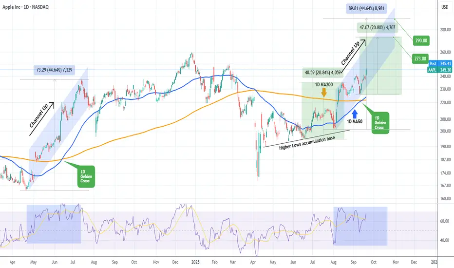 Apple Inc. (AAPL) completed this week its first 1D Golden Cross in over 1 year (since June 13 2024). The price has posted a strong 1D candle today on positive iPhone 17 fundamentals and it appears that the price is extending the very same Channel Up it had in May - July 2024.