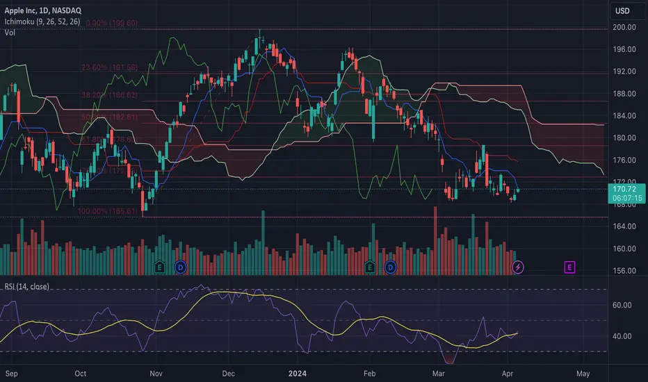 Apple Inc. (AAPL) stock is currently showing mixed signals on the daily timeframe when assessed with the Ichimoku Kinko Hyo indicator. The price is trading below the cloud, indicating a bearish bias in the market. The conversion line (blue) is below the baseline (red), which often suggests that bearish momentum is present. However, the lagging span is above the price from 26 periods ago, which can sometimes indicate weakening bearish momentum or a potential reversal.
