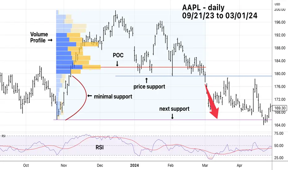 Apple Inc (AAPL) has broken below price support at 179.25, and the widest part of the Volume Profile called Point of Control (POC). Price tends to move towards or away from POC. The downside break of POC could be very bearish.