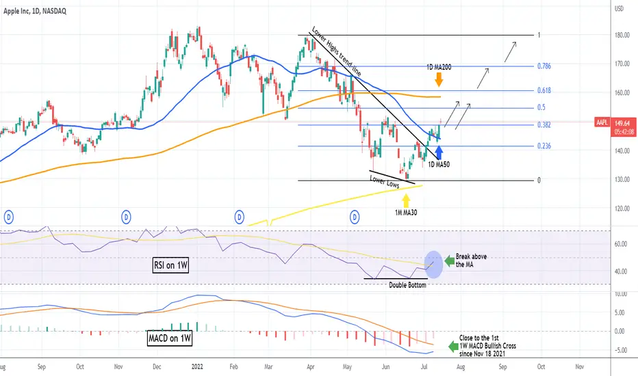 Apple (AAPL) had a very strong 1D green candle yesterday, rebounding off the 1D MA50 (blue trend-line), which has been the Resistance since April 21, turning it into the Support. The break-out took place after the RSI on the 1W time-frame broke above its MA line on the widest margin since January 04. With the 1W MACD about to make the first Bullish Cross since November 18 2021, this could be the long-term buy signal that the market has been waiting for, for a sustainable recovery.