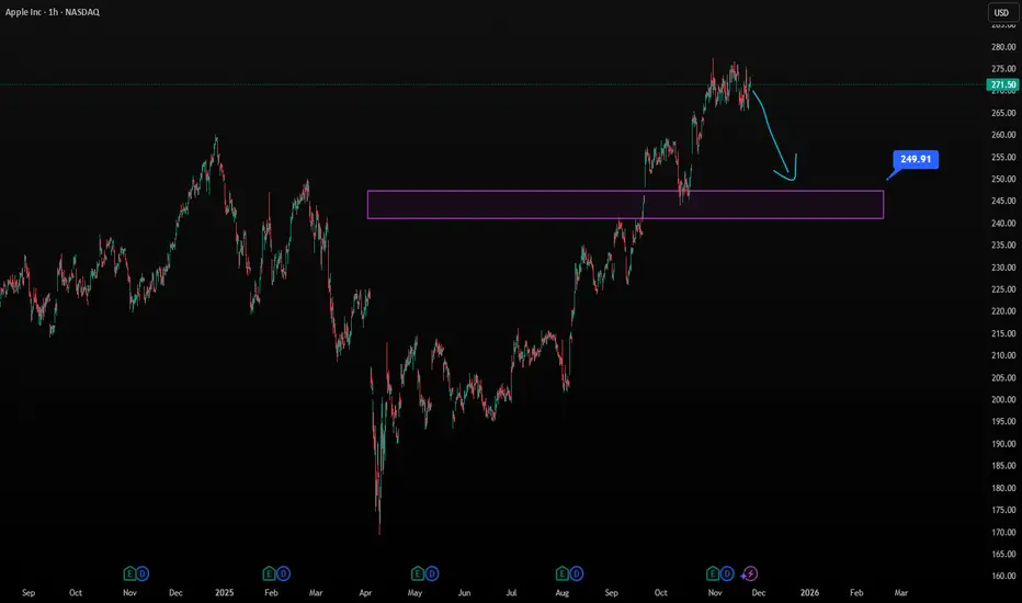 AAPL 's H1 chart suggests a midterm pullback from $271 toward $250 as trend strength softens. Technically, momentum indicators show divergence after a steady climb. Fundamentally, stable services revenue supports the stock, but softer global device demand may limit upside near term. A correction to $250 would align price with fair-value zones.