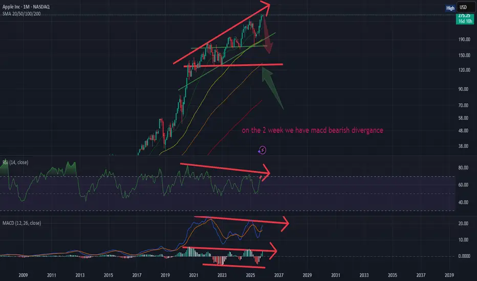 i see appl has about 7% left to go before we see a potential reversal .we have been in a bullish channel for over 5 years.in as little as 7 months appl has gained over 60% and is now time for a correction as well as the whole market as a whole also we have bearish negative reversal on the 4 week time.it looks like we will find support around the 100 day moving ave.we have all signs pointing to sell this market looks like its about to crash.