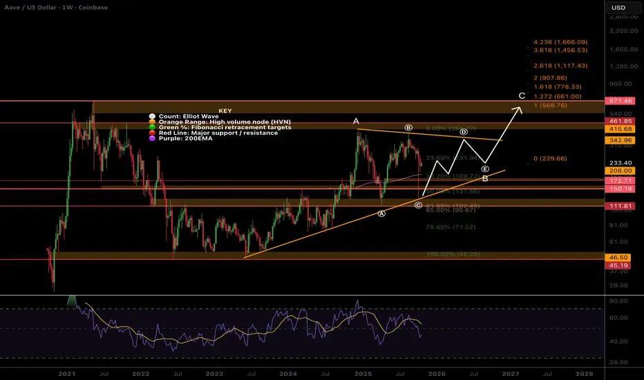 Weekly RSi still has room to fall with no bullish divergence yet. The next longer term target will be the pivot point and the top of the first wave of wave D, $260, followed by the triangle upper boundary at ~$340. Breaking out of the triangle has a first target of the all time high at $670. Not what AAVE investors want to see but still a x3 from here.