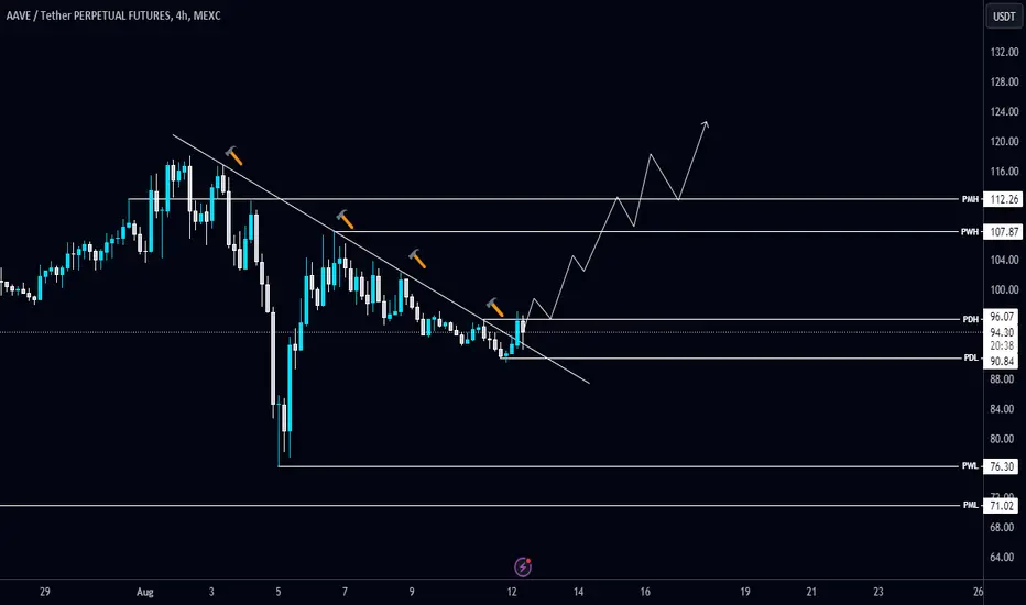 AAVE is held above it. The local resistance level is PWH $107.87 and the support level is PWL $76.3.
