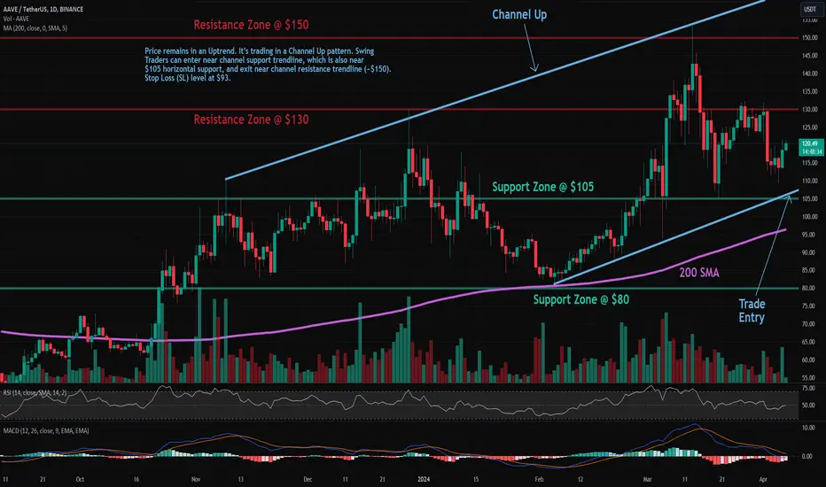 Trade setup: Price remains in an Uptrend. It’s trading in a Channel Up pattern. Swing Traders can enter near channel support trendline, which is also near $105 horizontal support, and exit near channel resistance trendline (~$150). Stop Loss (SL) level at $93.