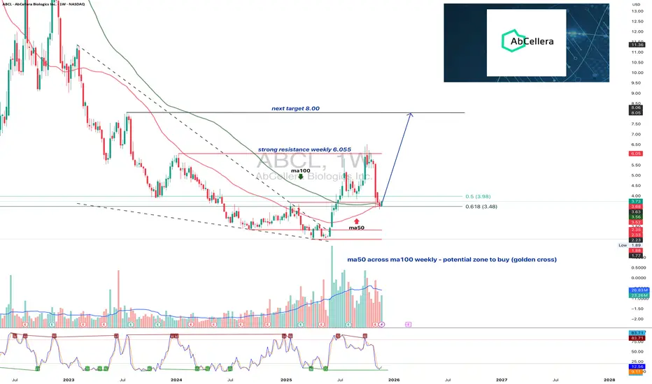 ABCL has tested the strong weekly support zone between 3.48 and 3.98. This area combines Fibonacci retracement levels, a previous breakout retest and an important signal with ma50 crossing above ma100. Such a combination often forms a reliable accumulation zone. Buyers reacted immediately from this region which confirms active demand. The nearest key resistance is located near 6.05. A confident close above this level opens the path toward the next target at 8.00.