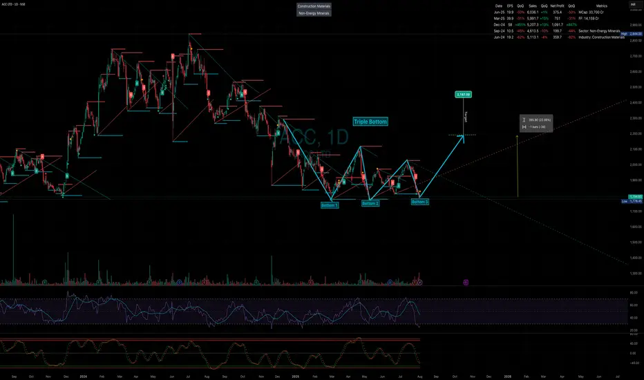 ACC Ltd. is currently showing a Triple Bottom formation on the weekly chart, indicating strong support around the ₹1810 - ₹1793 level . This pattern suggests that bearish pressure is weakening and a potential reversal is on the cards.