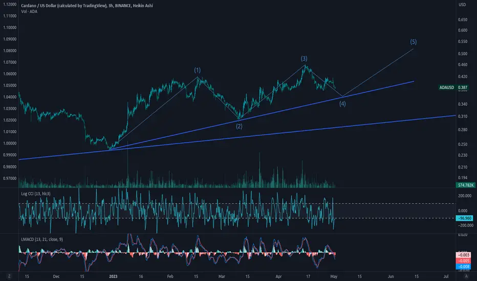 Elliot wave projection for Cardano forming higher highs and higher lows bouncing on trendline kicked off beginning of 2023