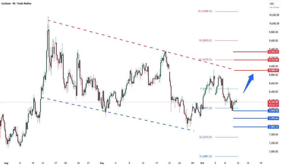 Bullish bias remains intact while the ADAUSD holds above 7960. A sustained break below this level could shift momentum to the downside in the short term.
