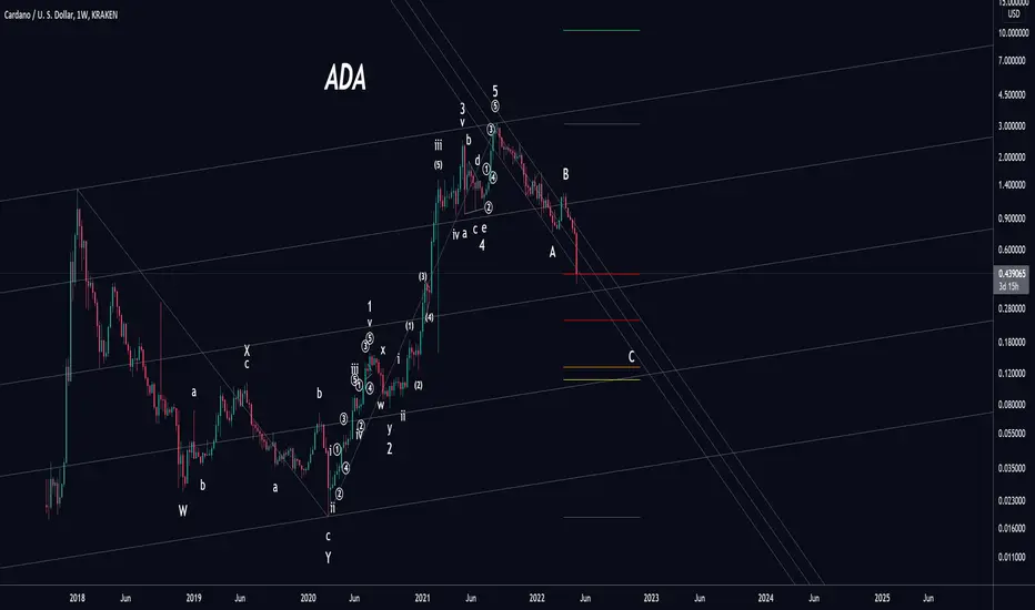 ADA did a fake breakout and collapsed afterwards. A failed bullish pattern (over-throw, iH&S, etc) will be very bearish. We are currently breaking the downward channel to the downside. We have reached the log 38.2% retracement. If BTC breaks down, we could easily reach the GZ. On the lower TF, ADA might move into algo extensions after a traditional series (chart #2). After a clean impulse up, we should expect an ABC down. But beware: as always when using the EWP, decent price history is required, and we don't have it in ADA. The market environment (VIX) has caused the recent dump in ADA, preventing us to see balance in the corrective pattern we are starting.