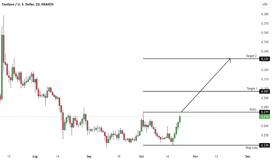 Waiting for the upward break of 0.275 resistance level, which will complete a bullish trend reversal pattern to go LONG. Only the downward break of 0.239 would cancel the bullish scenario.