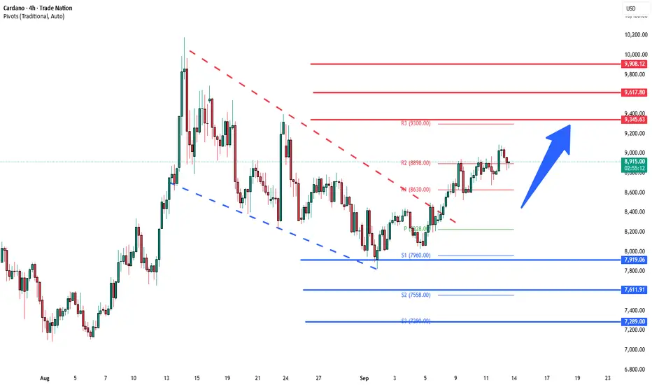 Bullish bias remains intact while the ADAUSD holds above 7920. A sustained break below this level could shift momentum to the downside in the short term.