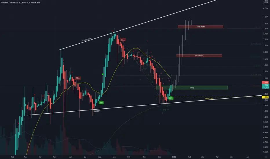 ADA is looking to start an upward move to retest the resistance trendline from a few months ago. Multi time frame squeezes are forming. A volume break above 1.60 will get us quickly get to above $2. Keep tight stops and scale out as we get closer to key fib levels and previous ATH. There will be many whales selling there.