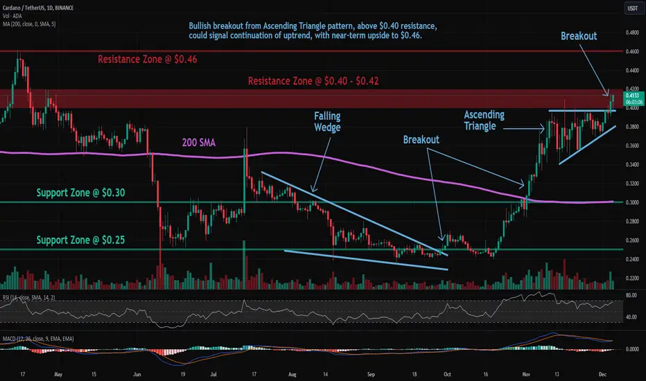 Trade setup: Bullish breakout from Ascending Triangle pattern, above $0.40 resistance, could signal continuation of uptrend, with near-term upside to $0.46. Previously, price broke above 200-day moving average ($0.30), which confirmed a bullish trend reversal to an Uptrend.